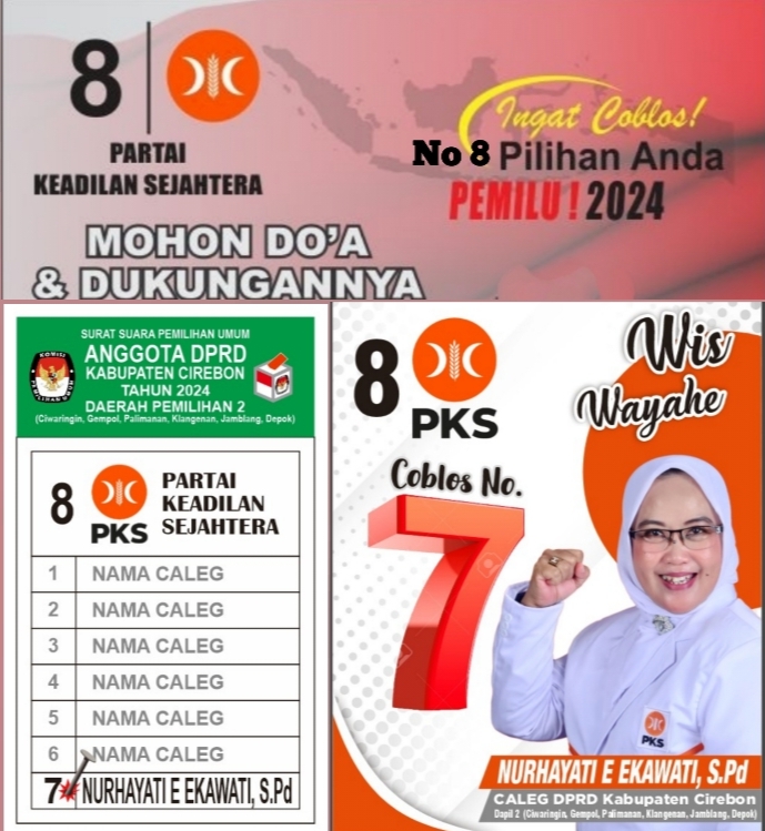 Mari kita sukseskan pemilu 2024 bersama partai PKS dan..mendukung sekaligus menjadikan Nurhayati E Ekawati S.Pd untuk duduk jadi anggota DPRD kabupaten Cirebon dari wilayah dapil 2 Daerah pemilihan 1 kecamatan Ciwaringin 2 gempol.3 Palimanan 4 klangenan 5 Jamblang 6 Depok, sukses buat ibu Nurhayati E Ekawati ::;;;;;;!!!!!!Merdeka
